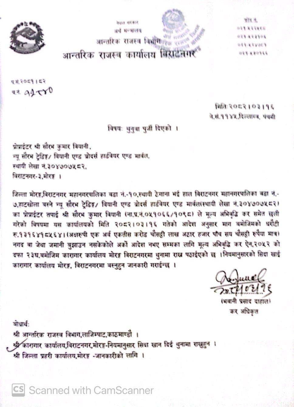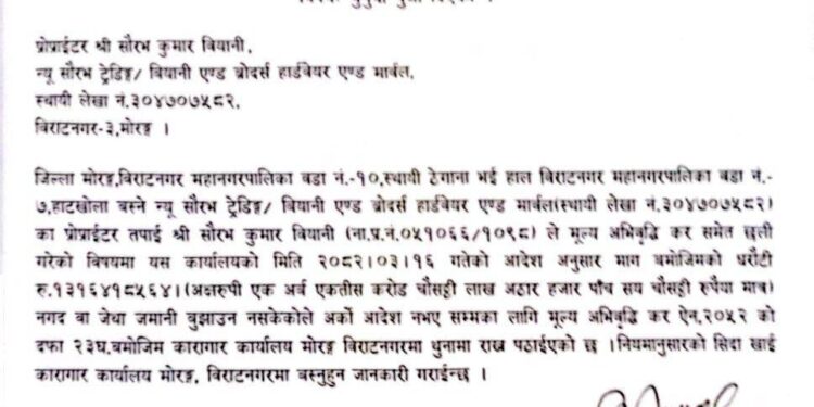 Kathmandu, Nepal — The arrest and imprisonment of Saurabh Kumar Biyani, a hardware trader from Biratnagar, on charges of involvement in fake VAT billing has sent shockwaves through the city’s business community. The Inland Revenue Department and the Inland Revenue Office, Biratnagar, apprehended Biyani on Asar 16 (early July), imposing a hefty fine of NPR 1.31 billion for his alleged fraudulent activities.