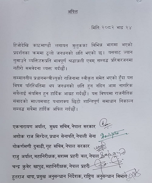 Kathmandu – Nepal’s security agencies, including the Nepali Army, alongside senior officials such as the Chief Secretary and Home Secretary, have urged political leaders and protesters to seek a peaceful resolution to the ongoing unrest through dialogue.
