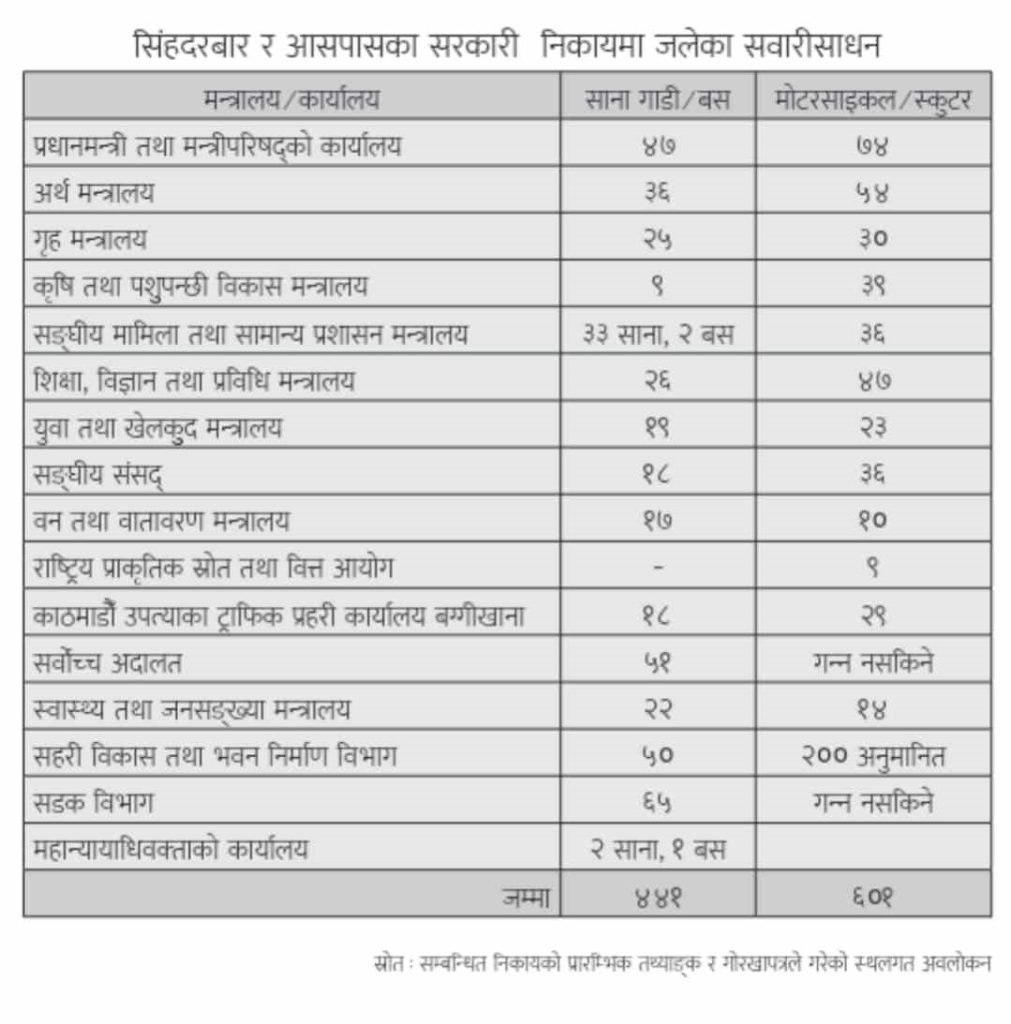 गोरखापत्र दैनिकको स्थलगत अवलोकन र सम्बन्धित निकायले संकलन गरेको तथ्याङ्कअनुसार, प्रधानमन्त्री तथा मन्त्रिपरिषद्को कार्यालयदेखि शिक्षा, स्वास्थ्य, गृह, अर्थ, सडक विभाग र महान्यायाधिवक्ताको कार्यालयसम्मका सवारी साधनमा आगजनी गरिएको हो। केवल प्रधानमन्त्री तथा मन्त्रिपरिषद्को कार्यालयका मात्र ४७ गाडी/बस र ७४ मोटरसाइकल/स्कुटर खरानी भएका छन्।
