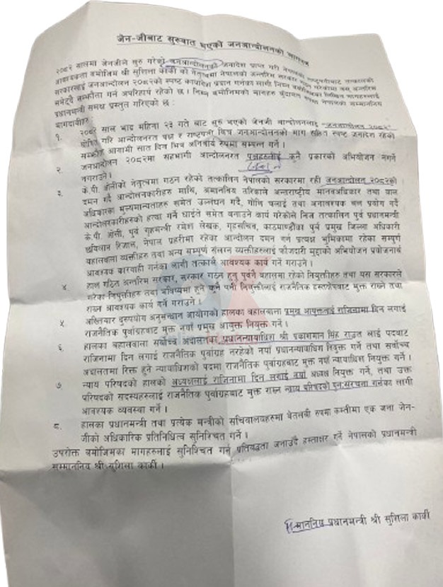 तर त्यसमा उल्लेखित मागहरू — जस्तै प्रधानन्यायाधीश प्रकाशमान सिंह राउत र अख्तियार प्रमुख प्रेम राईलाई राजीनामा दिन लगाउने, न्याय परिषद् पुनर्गठन गर्ने, र जेनजी आन्दोलनलाई जनआन्दोलन–०८२ नामकरण गर्ने — विषयमा अन्य सहभागीहरूले आपत्ति जनाए।