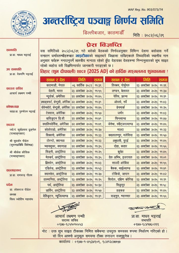विश्वभरका नेपालीका लागि भाइटीका: अन्तर्राष्ट्रिय पञ्चाङ्गले देशअनुसार साइत सार्वजनिक गर्यो