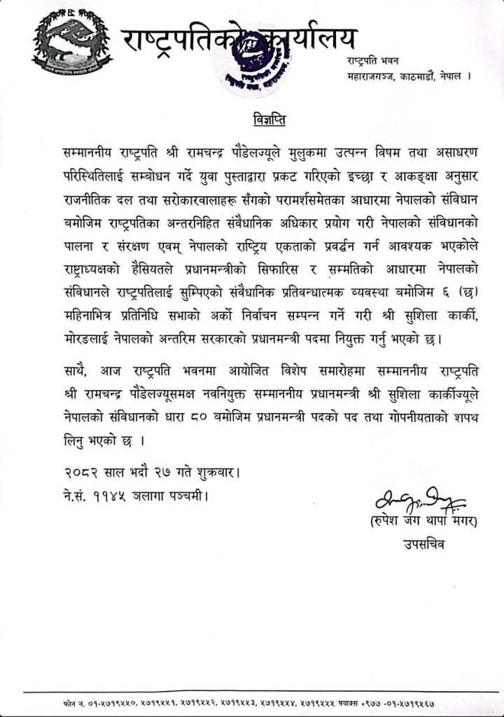 सुशीला कार्की भदौ २७ गते प्रधानमन्त्री नियुक्त भएकी थिइन्।
