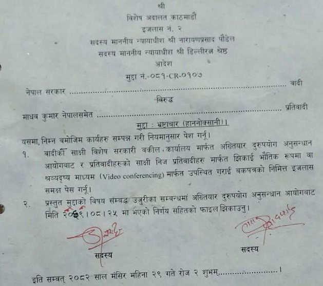 न्यायाधीश नारायणप्रसाद पौडेल र डिल्लीरत्न श्रेष्ठको इजलासले अख्तियारले २०६९ मंसिर २५ गते गरेको निर्णयसहित सम्पूर्ण फाइल अदालतमा पेस गर्न निर्देशन दिएको हो। उक्त आदेशसँगै अदालतले मुद्दासँग सम्बन्धित साक्षीहरूलाई प्रत्यक्ष वा श्रव्यदृश्य माध्यमबाट उपस्थित गराई बकपत्र गराउन पनि आदेश दिएको छ।