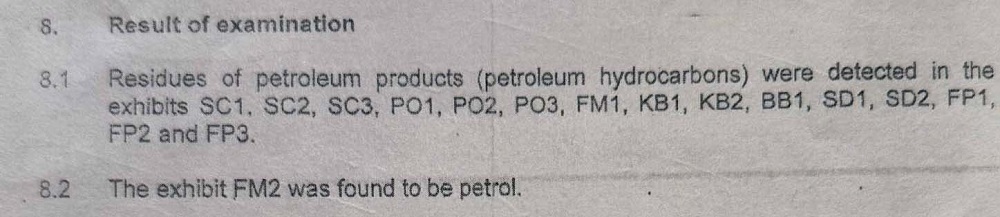 नेपाल इन्भेस्टिगेटिभ मल्टिमिडिया जर्नालिज्म नेटवर्क (निमजिन) ले प्राप्त गरेको फरेन्सिक प्रतिवेदनअनुसार ती स्थानबाट संकलन गरिएका नमुनामा पेट्रोलियम हाइड्रोकार्बनका अवशेष फेला परेका छन्, जसले आगजनीमा पेट्रोल वा अन्य पेट्रोलियम पदार्थ प्रयोग भएको संकेत गर्छ।